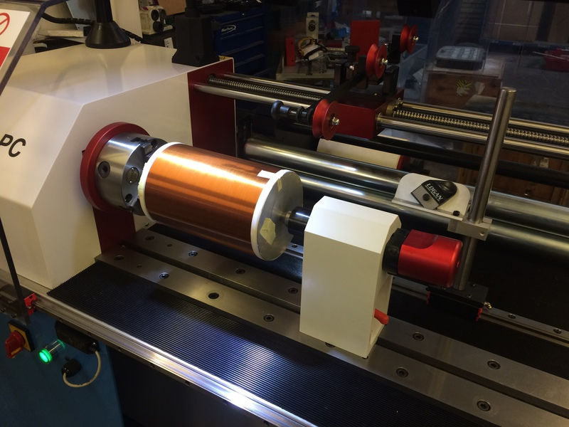 The WT 300 is a floor standing coil winding machine specifically designed for the production of small to medium size coils and transformers. It is made of a high quality aluminium framework and robust mechanical parts. The main spindle is driven by a 1.5kW servo motor, via a 2 step pulley to give a good range of speeds and torques. The wire guide carriage is mounted on precision hardened steel rails with linear bearing guides and is driven by a 400W servo motor and precision ball screw. An encoder on the main spindle provides high performance and exact movement of the wire guide.
